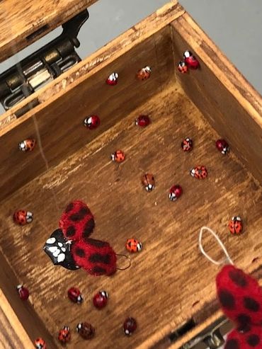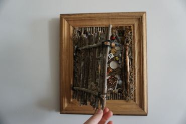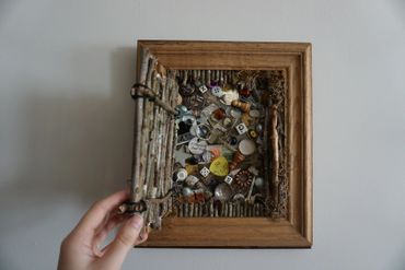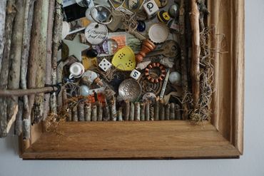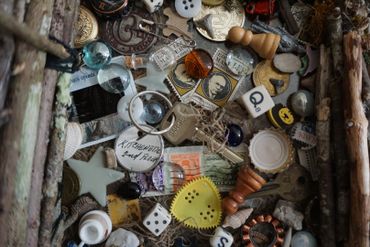 Plexiglass, plastic, 5" mirror, metal ball bearings, Palm tree wood.